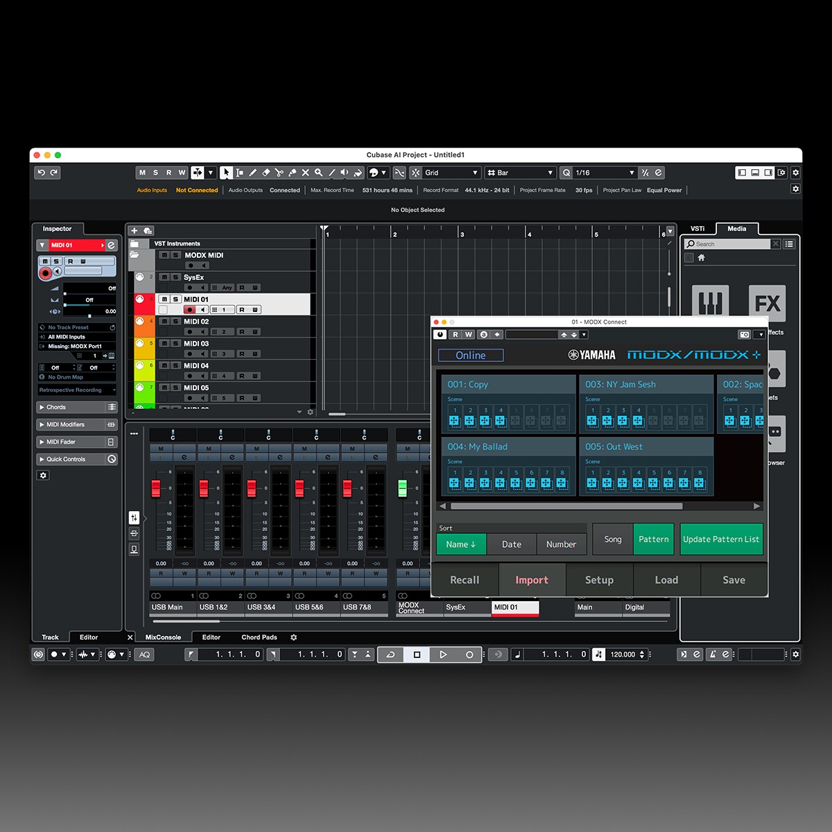 MODX+ Connect ที่ใช้เทคโนโลยี VST3 ของ Steinberg จะทำหน้าที่เป็นปลั๊กอิน VST3 กับ Cubase ซีรีส์ MODX+ Connect ยังทำงานเหมือนกับซอฟต์แวร์เครื่องมือ VST อื่นๆ ทำให้คุณสามารถบันทึกการตั้งค่าของ MODX+ ที่มีการแก้ไข หรือใช้การตั้งค่าดังกล่าวกับโปรเจ็กต์อื่นได้