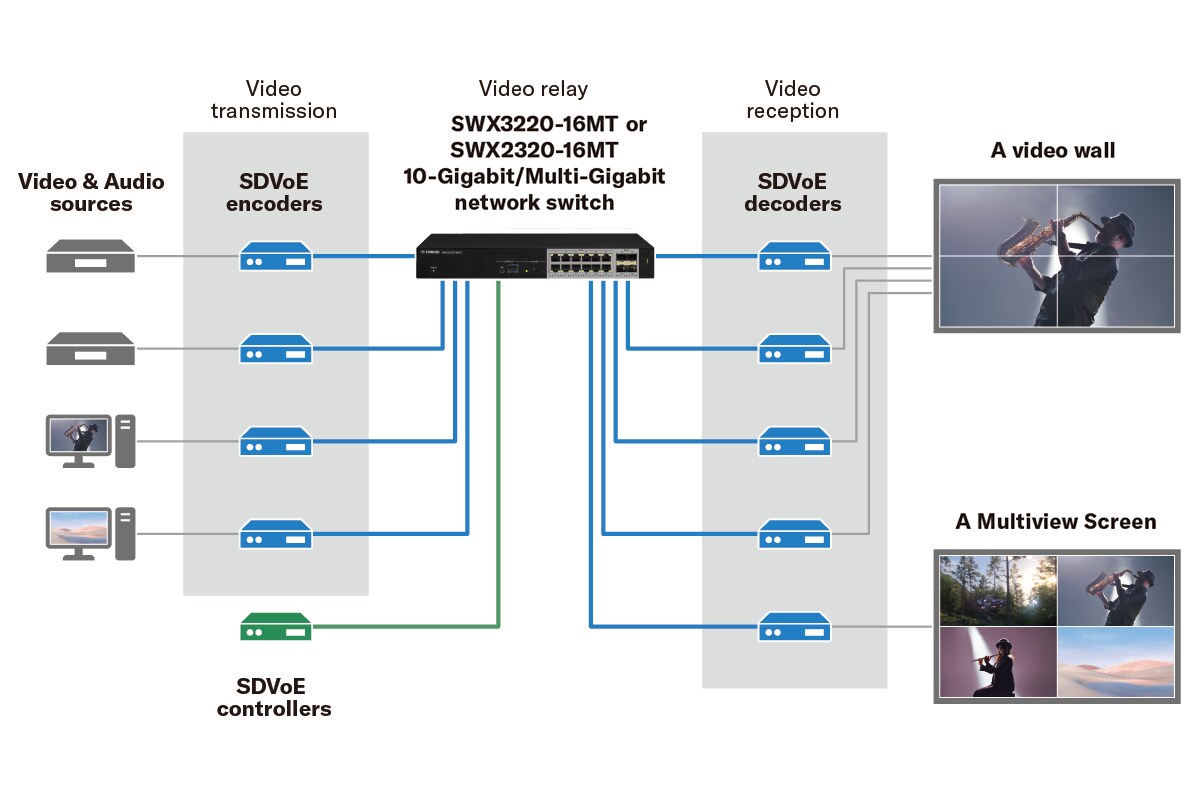 การรวมสวิตช์เครือข่ายของ Yamaha เข้ากับตัวเข้ารหัส SDVoE, ตัวถอดรหัส, แหล่งสัญญาณภาพ/เสียงความละเอียดสูง, จอมอนิเตอร์และอุปกรณ์อื่นๆ ทำให้สามารถส่งผ่านเนื้อหา AV คุณภาพสูงในระยะไกลได้