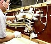 The photographs below show wood veneers that are glued together lengthwise to form a layer of the piano's rim. These layers are joined together to make a single long board by being glued and laminated. The number of laminations of these layers varies depending on the model, but is usually from 6 to 10.