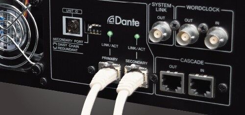 In recent years one audio network has emerged as a favorite that has been adopted by more than 200 licensees around the globe: Dante, developed by Audinate. The use of Dante audio networking technology in Nuage I/O allows high-quality, ultra-low latency audio transmission via standard Ethernet cables in systems that are quick and easy to set up. A secondary port supports redundant audio network connections to keep the network running even if a problem occurs.