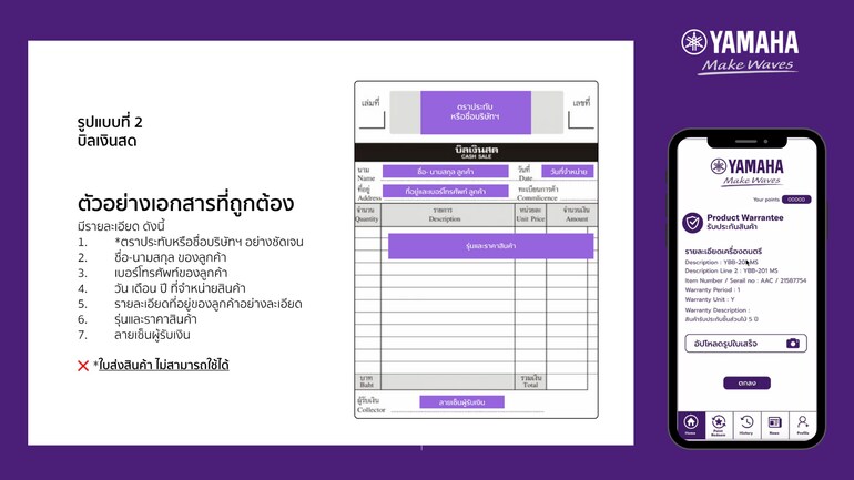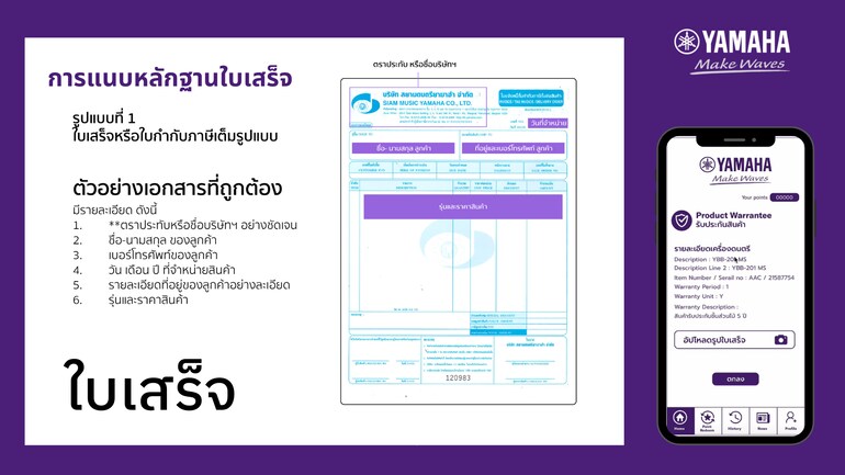 “สินค้า” หมายถึง สินค้าที่ผลิต สั่งผลิต นำเข้า หรือจัดจำหน่ายโดยบริษัท สยามดนตรียามาฮ่า จำกัด หรือตัวแทนจำหน่ายอย่างเป็นทางการที่ได้รับอนุญาตจากบริษัท สยามดนตรียามาฮ่า จำกัด และลูกค้ายามาฮ่าได้ซื้อสินค้าจากบริษัทฯในประเทศไทยเท่านั้น โดยบนตัวสินค้าต้องมีหลักฐานระบุหมายเลขเครื่อง (Serial Number) พร้อมใบเสร็จรับเงินที่มีข้อความชัดเจนระบุหมายเลขเครื่อง (Serial Number) ที่ตรงกันเท่านั้น
